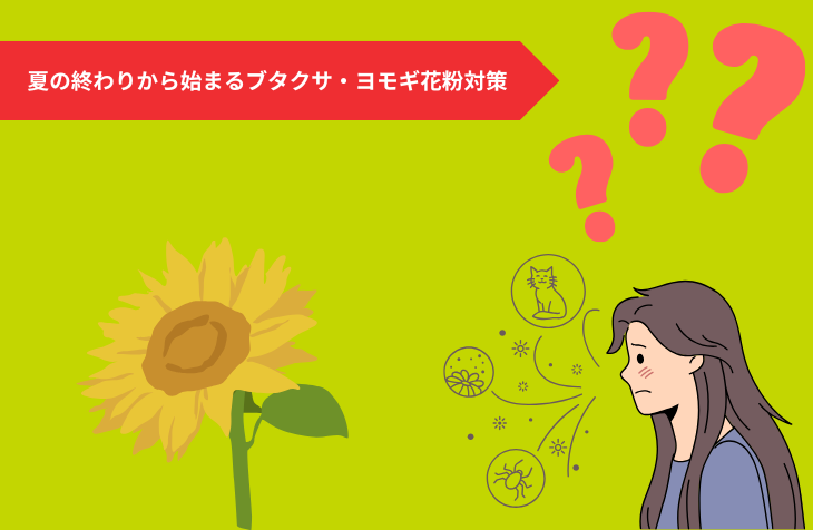 秋の花粉症はブタクサ・ヨモギが主な原因で、夏の終わりから症状が出やすくなります。
