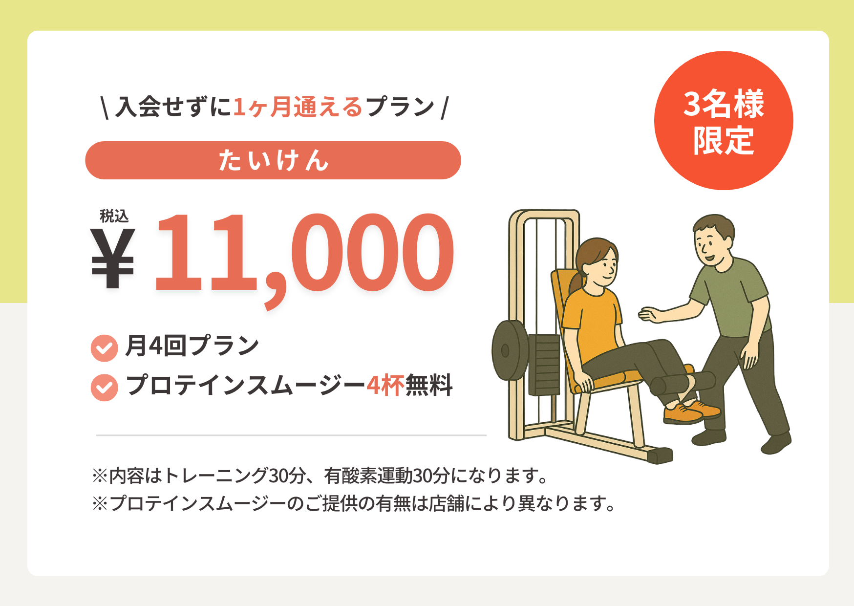 「トレーナーとコミュニケーションを取ってから決めたい」そんな方に向けて、1ヶ月体験をご用意しております。入会しないでパーソナルを体験出来るのは絆ならではのメリットです!