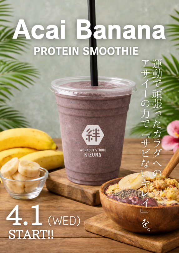 4月限定メニューとして登場した、濃厚なアサイーと甘熟バナナを組み合わせたスムージーです。トレーニング後のリカバリーはもちろん、忙しい日々の栄養補給としてもおすすめの一杯。販売は4月中のみとなりますので、気になる方はお早めに。