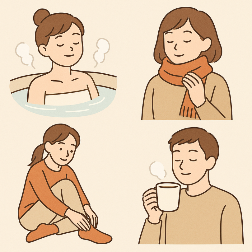 - 首・お腹・足首を温める:3つの首を温めると血流が一気に改善