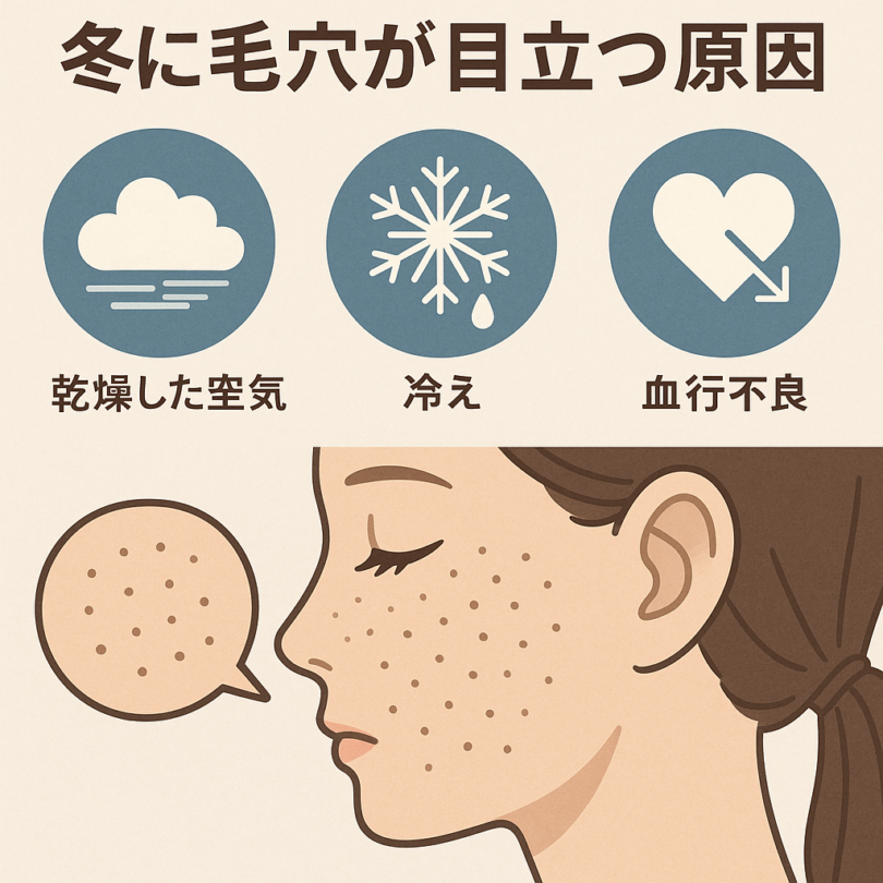 冬に毛穴が開くのではなく、「毛穴が見えやすくなる」のが正解です。